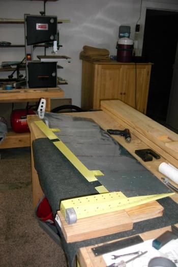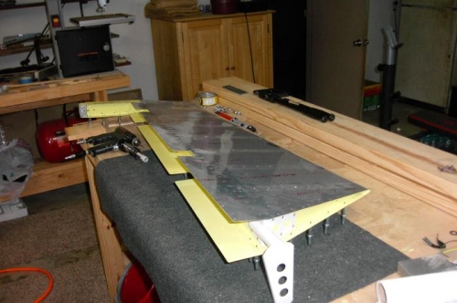 Finished riveting the right elevator together. I was able to use the thin rivet squeezer for all but the last rivets near the back of the elevator. For those I used a piece of 1/4" steel as a bucking bar and it worked okay. Have to roll the leading edges tomorrow. Going to use "Gorilla Tape" as it was recommended instead of regular duct tape for rolling.