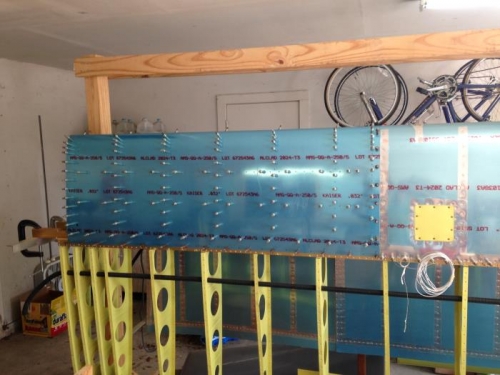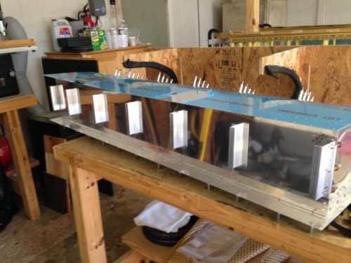 Started by drilling out the center hole in the baffle plates. Then used the lines on the brackets to drill the other holes. When everything was drilled out, I cleco'ed the brackets onto the ribs from the inside, then finished closing the skins. After everything was cleco'ed, put the tank on the wing and used the holes in spar to drill the holes into the brackets.