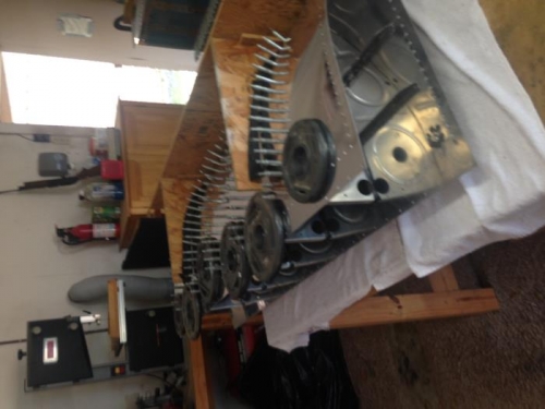 Installed left tank ribs with Pro-Seal and cleco'ed in place. Weighted to cure for 48 hours.