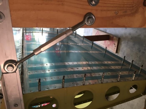 Riveted the inboard wing skins into place. Used a new bucking bar. Found it was easier to have Nathan drive the rivet gun while I bucked. Got all the rivets except the very top row set.