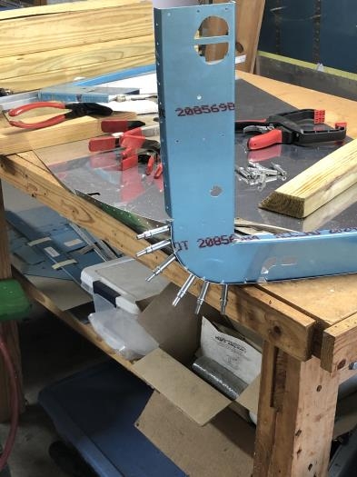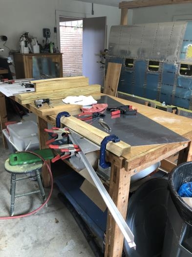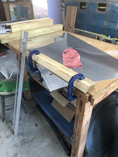 Rolled fuselage skins. Used aluminum angle as per the Van's directions. It worked okay but the angle got bent all to heck. Ended up using Vise-Grips instead of clamps as they held the angle more securely and provided handles to grab.