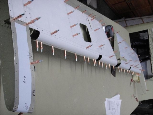 Pinch trailing edges in bending brake. Cleco in place. Difficult to get small skins over rib without any creases forming on the sharp corners round the leading edge.