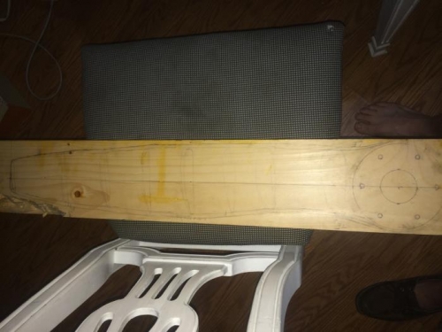 Rough sketch of propeller outside profile. Doing plenty of research on airfoil selection for inner 40% to contribute to strength and engine cooling and outer 60% for efficiency and proper thrust value for an engine @ 3000-3300 RPM cruise. Doing one half of the propeller and then using router duplicator to turn it into a hard wood.