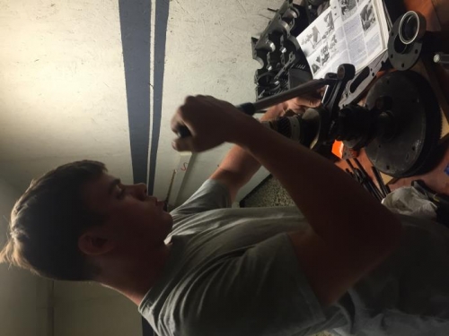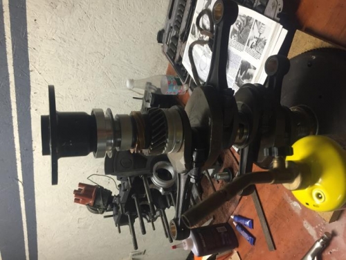 Orinted crankshaft verticle using flywheel (which will be cut later) for installation of #1 Main Bearings, Oil Slinger, and Woodruff Key. With that done Prop Hub was heated with MaPP Gas torch until it had a purple color on lower portion, and it was slipped over crank "nose" and tapped down with hammer to ensure proper seating. IT IS NOW AN AIRPLANE ENGINE!