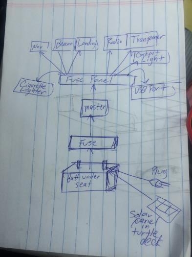 Sketched rough electrical system plan. Using small sport vehicle battery under seat, fan generator, small solar panel in turtle deck to supply power for radios, lights, etc. Found good source for LED lights that will work for VP-1. Will be refined as needed.