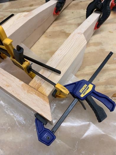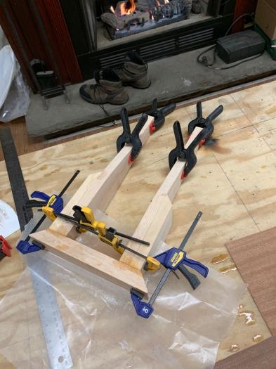 Jigged and glued Landing Gear Reinforcement2 - sanded individual legs and squared bases - clamped to existing reinforcement piece to make identical jig - glued base to vertical pieces and clamped