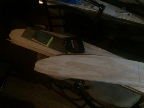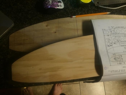 Modified "template" rib that I used for router, to include the leading edge and trailing edge tip cutouts (1/2''' and 5/8'' respectively). I then used that to mark out the actual ribs and then cut them with a fine handsaw, some sanding will smooth the edges and get them back to standardized.