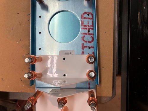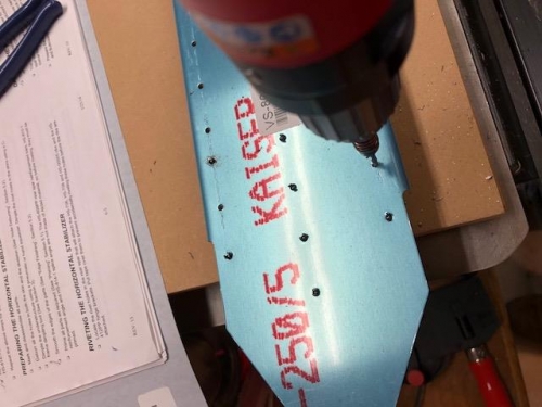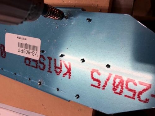 The VS-410PP hinge brackets have two holes missing from the pattern. Use the holes in the spar channel and spar doubler as drill guides and back-drill the entire six-hole pattern through the upper VS-410PP only. The corner holes in the lower VS-410PP will be drilled for bolts later, in assembly with the fuselage (See DWG 78).