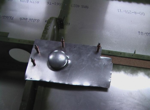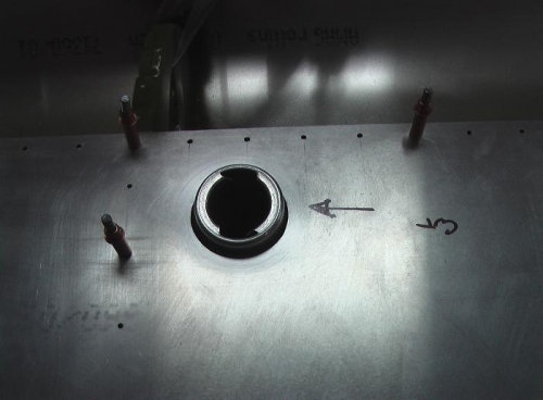 Created template for fuel cap loctions on top skin. I used scrap metal cut a 2.5inch hole and then located on the cap. I then used the strap duplicator to locate the hole on the main spar and rear rib. Next I located the same holes on the wing top skin and cut the holes using the template.