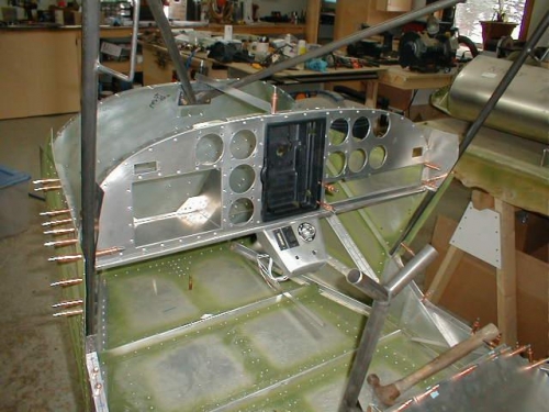 I finished building my instrument panel. I added aa small addition to the panel in center. This will house the ignition switch, Electric Flaps, cabin heat and cabin air. I bent the bracket out of .025 material and bolted it to the underside of the panel. I laid out and finish riveting the panel to the sub panel. It is now ready to be powder coated.