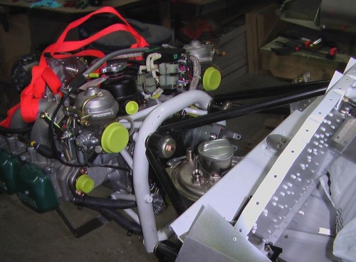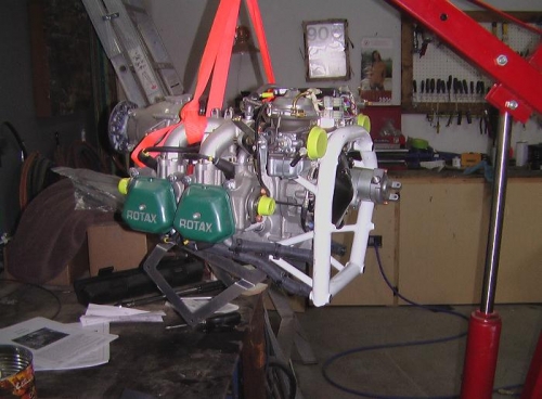After double checking all bolts and connections for tourqe and position I moved the engine into position. One at a time i was able to get the bolts lined up and snugged up. I found a clamp made it a little easier to compress the rubber.