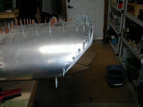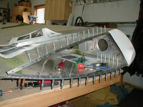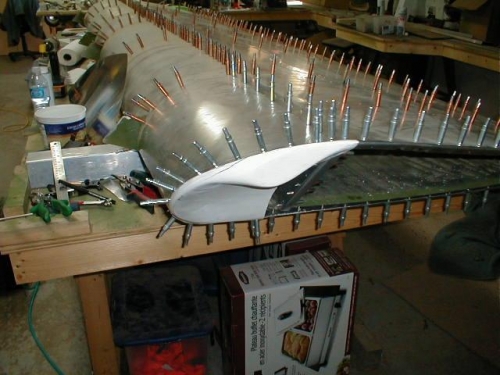 I took down the Left Wing and completed the wing tip. It was a tight fit getting the premade fiberglass tip in place. Crimped the L-Angles for the top and bottom and made sure that the crimps did not fall on the pre drilled holes.