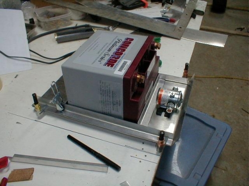 Built the battery box / hold down. Sealed gel battery so I was able to mount behind the passenger seat and not use the fibreglass battery box. I used a design that Brian (701builder.com) had done. Worked out great. I added stiffners to the base and attached all with A5 rivets. There are two bolts used to keep the tension on the case as well as it is lined with cork. I also mounted the Master contactor off the aft side of the battery.