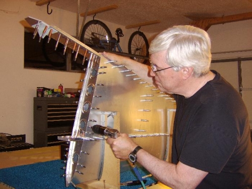It was pretty quick to match drill all the skin holes to #40. The older kit skin has an extra hole on each side at the root and tip which had no matching hole in the underlying newer ribs. Match drilled those. There is a clear plastic coating (another indicator of the kit's age) which I think I'll just remove entirely before dimpling and countersinking. I'll just have to be extra careful while riveting...