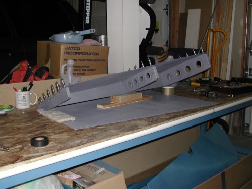 Finished riveting VS803 and 08, 411, 410 and 412. Prepared all ribs, primed and dimpled.