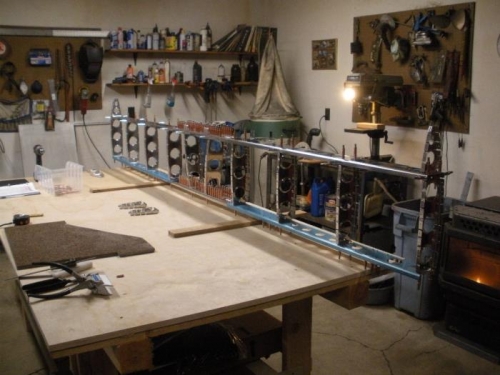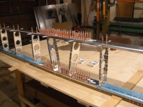Clecoed the spars and ribs together to form the frame work of the HS. Match drilled mounting holes and disassembled for de-burring. Fabricated the "cradle blocks" from the supplied plywood. Once again, i utilized the "CNC Router" to cut the jigs. Got everything set up and leveled on my work bench. Got the HS901 "Skin" out and used the soidering iron trick to remove the blue plastic along all the rivet lines.