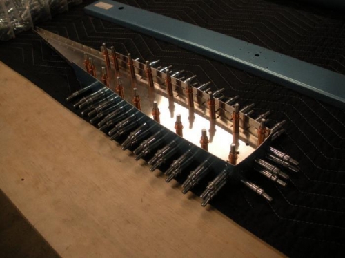 Finished deburring the skin... All stiffeners and dimpled the stiffenerrs. Moved on to assembling the conter balance arms. did a little fluting to straighten the ribs. Then the usual routine... Assemble, drill, take back apart. De-burr and dimple all parts.