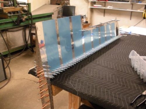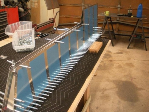 Stiffeners were all completed for the L. elevator at the same time i was doing the R.side. So, i assembled, match drilled, de-burred and dimpled all the L counter weight arm components. Assembled the counterweight arm, E902 spar, root rib, and E915 elevator spar to the skin.