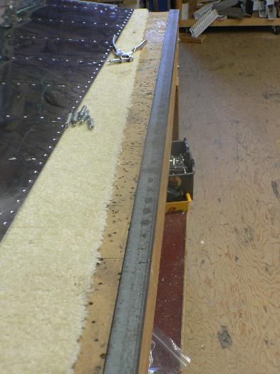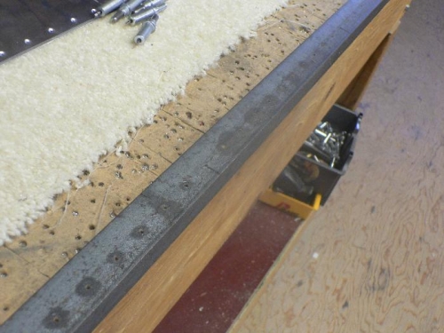 Prepared to seal the trailing edge together. I purchased a 6ft lenght of Steel angle and screwed oit to my work bench. I then I drilled holes in the angle to match the trailing edge of the rudder. This took awhile, but the drill press made it a little easier.