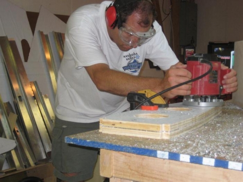 Cut out 9 more ribs tonight. Routers make it go faster, but it makes a big mess of shavings. The board on the workbench is to contain them to a somewhat smaller area.