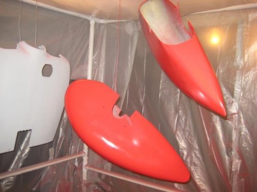 The wheel pants were painted last night, but needed to hang overnight. After taking this photo the pants were taken out, lightly wet sanded with 1000 grit paper, and set aside. I'll put on one more coat tomorrow night, then let them sit for a week before clear coating (if you don't wait a week, you risk major orange peeling of the paint).
