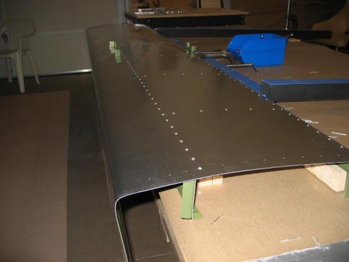 Drill out 2 bad rivets.Re-align & cleco Bottom skin.Rivet bottom skin. Whoops... remove 4 rivets from ends where "end ribs" attach.