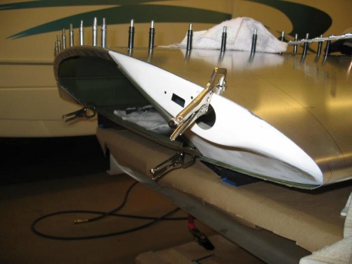 Shim fuel tank filler to flush with nose skin.Finish cleco on nose skin up to main spar.Finish fitting locker door and round corners.Start fitting forward fiberglass wing tip. - mix 5 batches of micro-balloon/epoxy filler to fiberglass to fit closer inside nose skin. (must dry overnight)Cut a plywood nose rib to hold correct nose shape at wing tip while fitting.