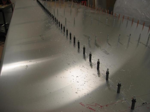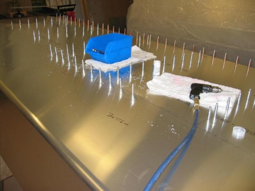 Finish layout of nose rib rivet lines.Drill bottom and top pilot holes in nose skin for nose ribs.Position nose skin and drill A5 rivets on front spar flange.Romove nose skin for debur and primer.