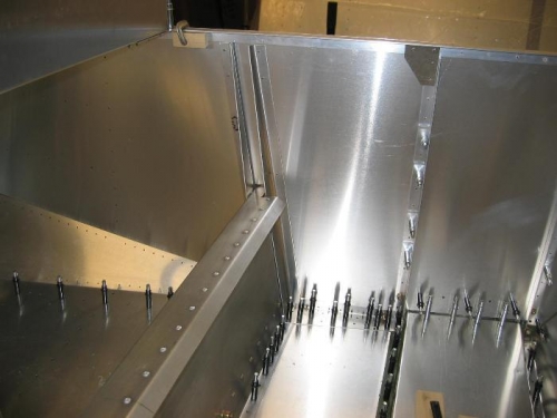 Fitting main spar supports and drilling forward rivet holes.