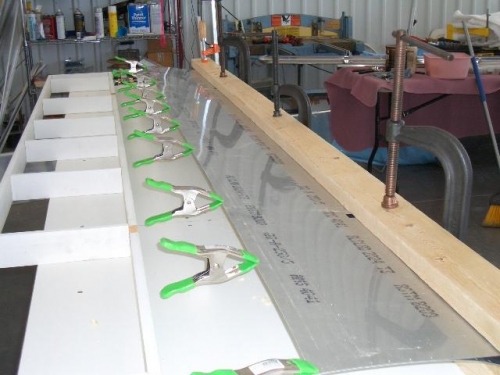 Made a jig out of a couple of 2X4's to sqeeze the leading edge radius of the flap skin. It worked pretty well made a little more defined bend rather than the smoother radius I was hoping for! The overall thickness measurement at the chord was reduced from 3" down to 2" making the fit to the nose ribs much better.