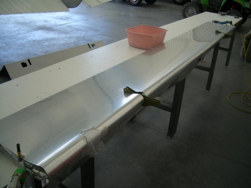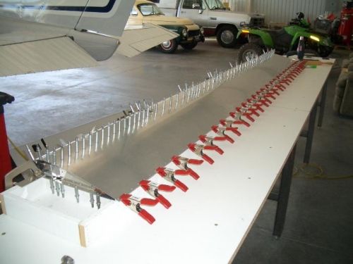 Finished straightening the nose ribs for the ailerons, then put last rib on flap spar and started drilling the flap skin. Bottom drilled, top spar drilled and the trailing edge clamped up ready for drilling!