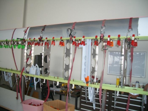 Finish putting pulleys on aft spar and position and cleco the 3 front nose skins. They are all drilled and clecoed ready for fitting the top and bottom skins!
