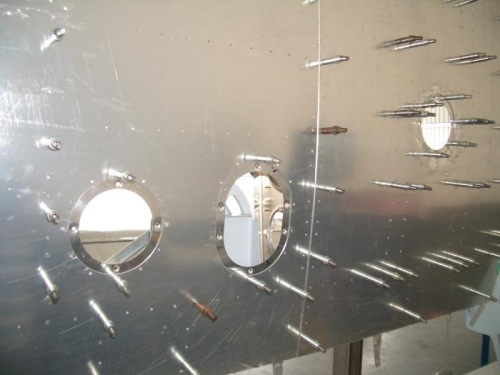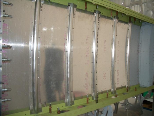 Finished fitting to hat sections and drilling them. Trimmed the nose skins for fitting with the top and bottom skins. Drilled the inspection flanges and also cut the inspection hole in the inboard bottom skin.