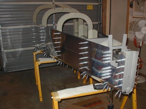 In preparation for match-drilling, dimpling, deburring and priming, the vinyl was removed and the manufacturing ink cleaned from the skins. Mike S. and I then worked on further bending the tail-cone skin (.040 inch thick) to form the proper shape. Also had to work at getting the tabs along the bottom of the F-711 and F-712 bullkheads to follow the correct radius at the proper angle. After much tinkering, the holes are lined up pretty close. At the time of drilling the J-channel stringers, it should pull together properly if I carefully drill one at a time and cleco as I go. The plumb-bobs on the bulkheads on each end of the fuselage are aligned on the tooling holes, so there is no twist to the fuse (Note: there is no tooling hole on the bottom of the F-706 bulkhead -- instead just determine bottom-center and hang the plumb-bob from the tooling hole at the top center). Ready to drill the J-channel stiffeners then the skin to the bulkheads below the holes for the longerons!!