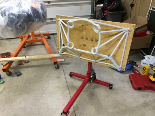 Installed nuts and bolts in spar that were left open for a 7a. Torqued. Ran conduit up firewall. Mounted motor mount onto plywood and onto engine stand. Installed oil pressure sending elbow onto engine. Started working on prop govenor.