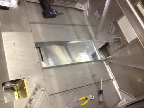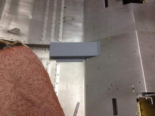 Finished center tunnel cover. I had to make a new top plate as I screwed up my hole measurements on the first. Lots of edge finishing. Fitting forward cabin cover. Primed heat baffle. Cut lip off of fuel selector valve plate.