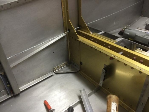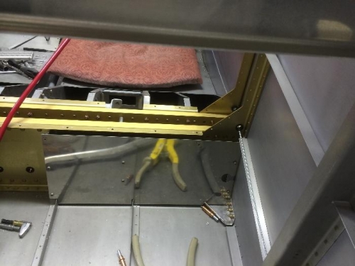 The outer plate on the main spar was slightly out of alignment to the main spar bars. I carefully sanded to open them up. It did not take much and I did not bump the spar. Re-installed gussets. Checked drift pins. F-782A coverplate and support angle. Support angle is riveted.