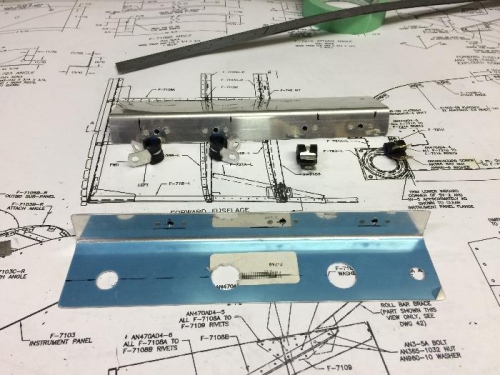 Made a mock up of the control bracket to determine spacing. Drilled the actual bracket and setup with nutplates. Setup supporting bracket as well. Cut template of panel to transfer holes to carbon fiber panel. Started working on vent brackets. Need to incorporate audio jacks and fill gap left by carbon fiber panel.