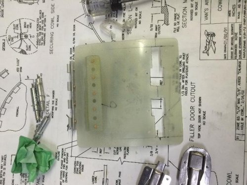 Sanded micro on cowl. Started on oil door. Cut and sanded. Installed hidden hinge with glue and soft rivets.