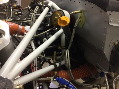 Installed dip stick with light rtv coat on both sides of gasket. Installed heat muff. Started on gear leg fairings.