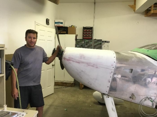 Mounted the prop with Dan Ruffatto. I put the cowl on and realized my gap to the spinner was too tight. Backfilled cowl with glass where necessary and sanded to open gap.