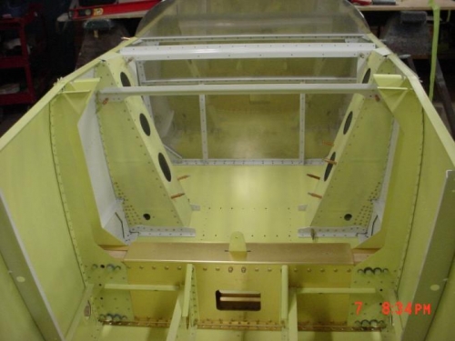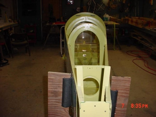 USED HOME MADE BUCKING BAR WITH HOLE DRILLED IN END TO BUMP OUT SOME OF THE INDENTIONS IN CORNERS OF BULKHEADS. TURNED FUSELAGE OVER. IN CANOE STAGE.