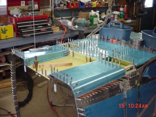 MATCH DRILLED FORWARD BELLY SKIN AND INTER STRUCTURE . FIT REMOVABLE DOORS FOR GEAR BOLTS AND DRILLED FOR PLATE NUTS. REMOVED PARTS AND STARTED DEBURING.