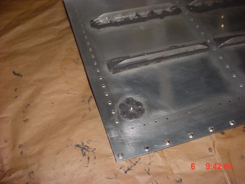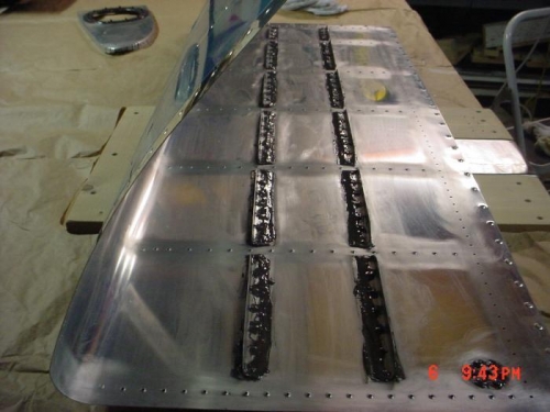 FINISHED PROSEALING AND RIVETING SIFFINER IN RIGHT TANK. PROSEALED AND RIVETED FUEL DRAIN.
