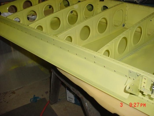 RIVETED RT AILERON GAP SEAL TO REAR SPAR. PREPPED RT. FLAP BRACKET AND PRIMED.