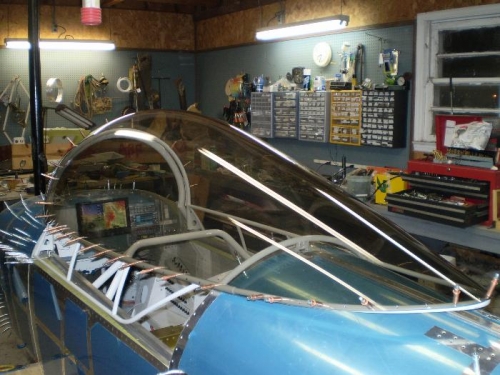 DRILLED CANOPY TO FRAME. USED #40 BIT FIRST THEN REMOVED CANOPY AND INLARGED TO 5/32 COUNTERSANK HOLES.