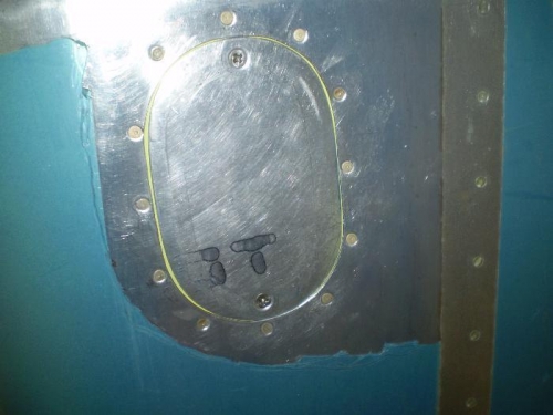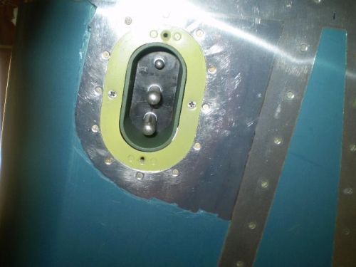 FABRICATED COVER PLATE FOR GROUND POWER RECEPTACLE MOUNTED TO FUSELAGE.