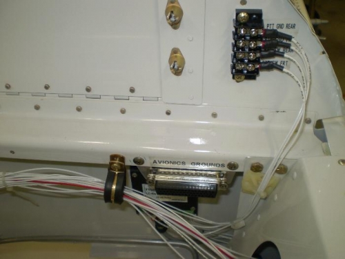 FABRICATED AVIONICS GROUND BLOCK AND MOUNTED. ALSO MOUNTED PTT TERMINAL BLOCK AND RAN WIRES FROM INFINITY GRIPS.