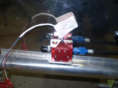 FABRICATED MOUNT FOR RED CUBE FLOW TRANDUCER AND MOUNTED TO FIREWALL.