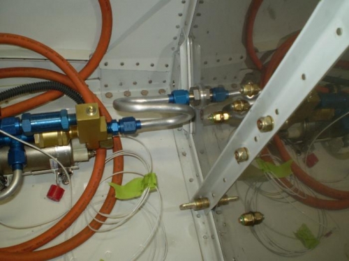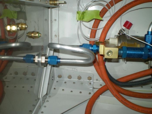 BENT FUEL LINE FROM ELECTRIC PUMP TO BULKHEAD FITTING AND DRILLED FIREWALL FOR BULKHEAD FUEL FITTING.
